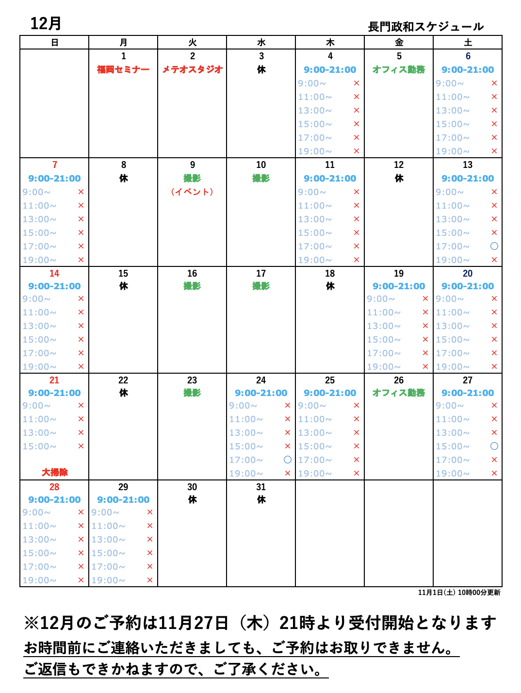 12月分は、貸切のお時間が取れなかったため、設定がございません。