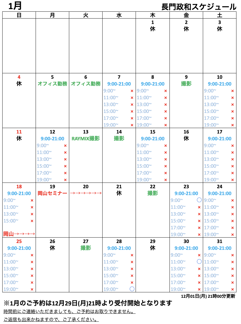 2026年1月分は、貸切のお時間が取れなかったため、設定がございません。
