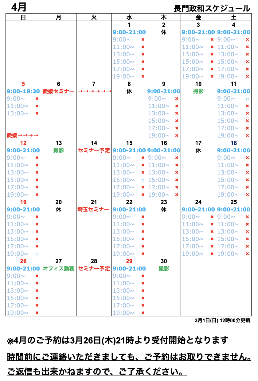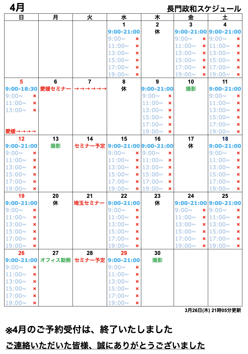 4月分は、貸切のお時間が取れなかったため、設定がございません。